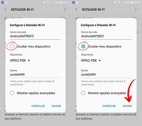 04. E Agora pra finalizar e concluir, marque a opção ” Ocultar meu dispositivo” e o seu wi-fi ficará oculto.